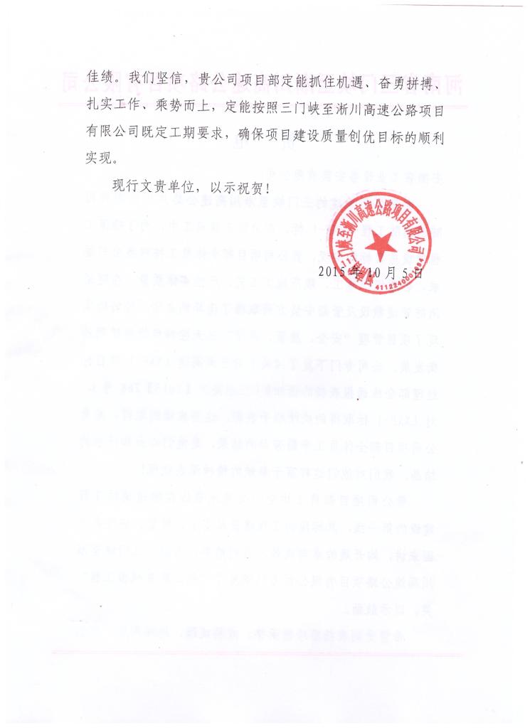 河南省三門峽至淅川高速公路項目有限公司向公司發來賀電