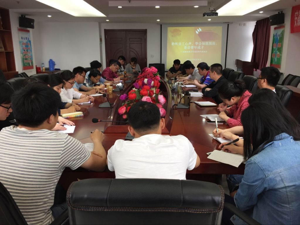 5月5日下午,安徽安裝公司團(tuán)委召開了以“聆聽員工心聲、學(xué)會知恩圖報、寄語青年成才”為主題的團(tuán)員青年座談會,公司黨委書記、副總經(jīng)理胡六中,紀(jì)委書記、工會主席李寬旭,副總經(jīng)理王勝利應(yīng)邀參加了座談會,與各位團(tuán)員青年交流談心。座談會由公司團(tuán)委書記王偉主持。