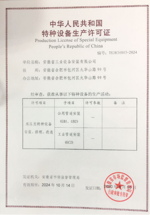 近日,安徽安裝公司壓力管道(GC2、GB1、GB2)安裝維修許可換證評(píng)審順利通過(guò)。