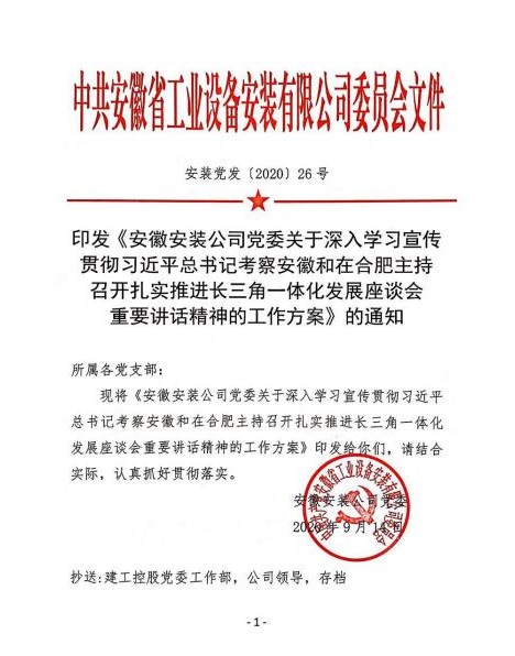 一是公司黨委迅速?lài)?yán)密部署學(xué)習(xí)宣傳貫徹各項(xiàng)工作。9月8日,公司黨委理論中心組率先帶頭,認(rèn)真學(xué)習(xí)重要講話精神,深刻交流研討。9月14日,安徽安裝公司黨委下發(fā)《關(guān)于深入學(xué)習(xí)宣傳貫徹習(xí)近平總書(shū)記考察安徽和在合肥主持召開(kāi)扎實(shí)推進(jìn)長(zhǎng)三角一體化發(fā)展座談會(huì)重要講話精神的工作方案》,結(jié)合公司實(shí)際,精心嚴(yán)密部署“大學(xué)習(xí)”“大宣傳”“大貫徹”和“大落實(shí)”工作,確保公司上下人人都學(xué)習(xí),人人都領(lǐng)會(huì)。