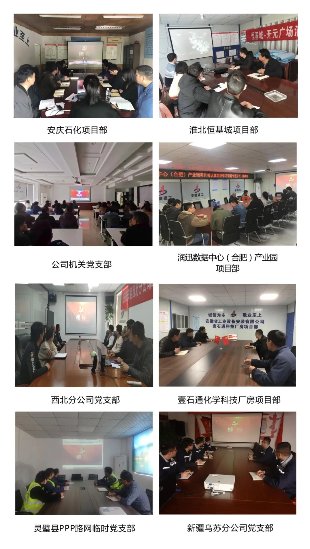 靈璧縣PPP路網臨時黨支部、壹石通化學科技廠房項目、潤迅數據中心(合肥)產業園項目、蚌埠康寧藥用玻璃管項目、安慶石化項目部于3月22日晚上立即組織共同觀看《榜樣5》,并視頻討論、召開會議等多種形式進行學習交流。