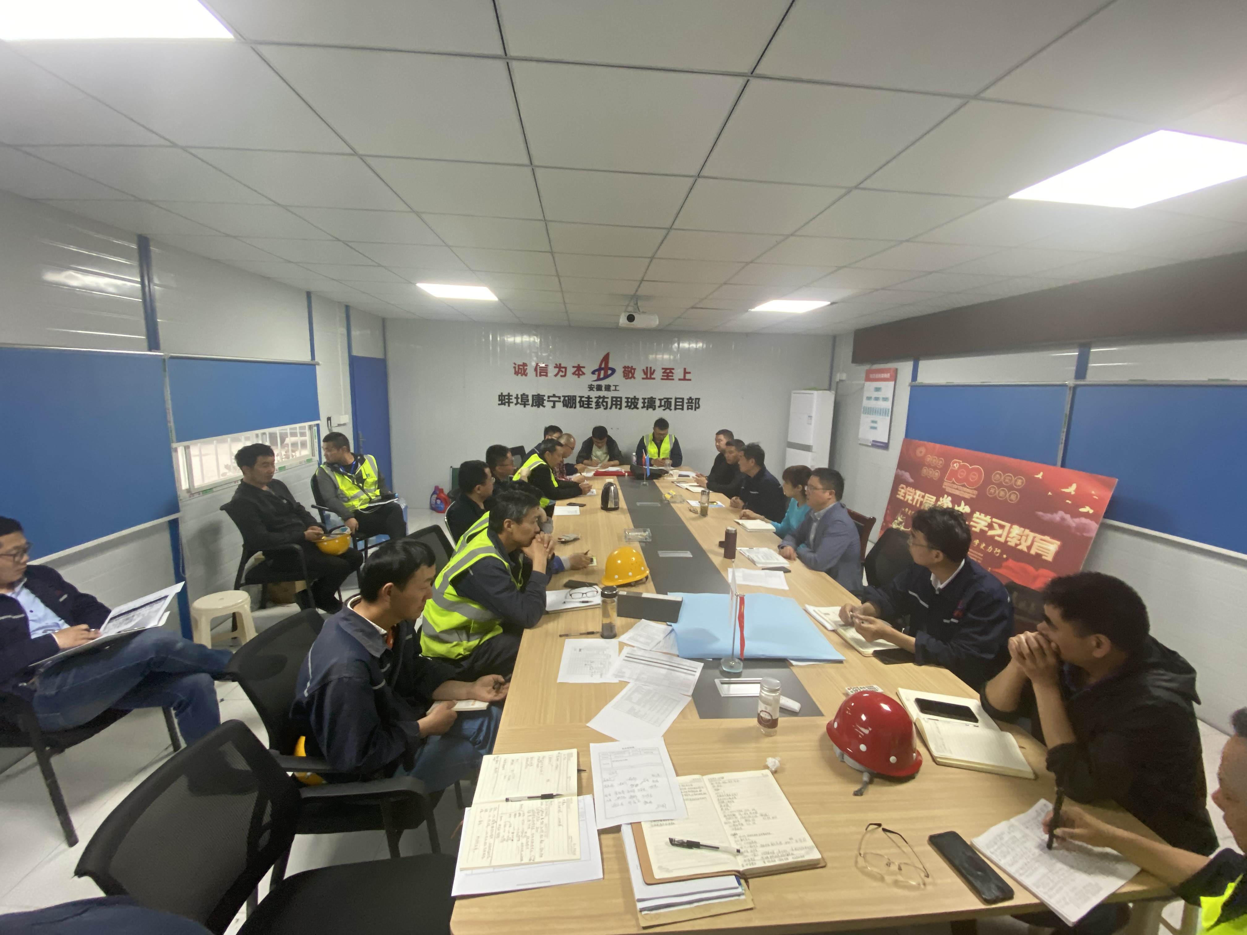 5月18日,雖然已是晚間八點多,但是位于蚌埠市中環線南、中糧大道以西的康寧藥用玻璃管項目現場到處是一片繁忙的景象。項目部會議室內燈火通明,全體參戰人員正在召開項目協調推進會,而在不遠處的施工現場,機器設備聲轟鳴,百十名施工人員在各自的崗位上緊張而有序地忙碌著。