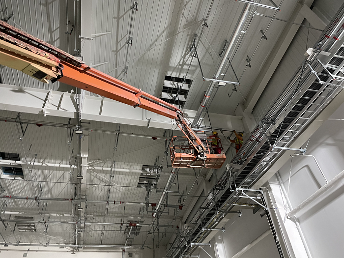 圖為室內電氣班組正在進行高天棚燈具安裝,對剩余工程量進行最后的沖刺