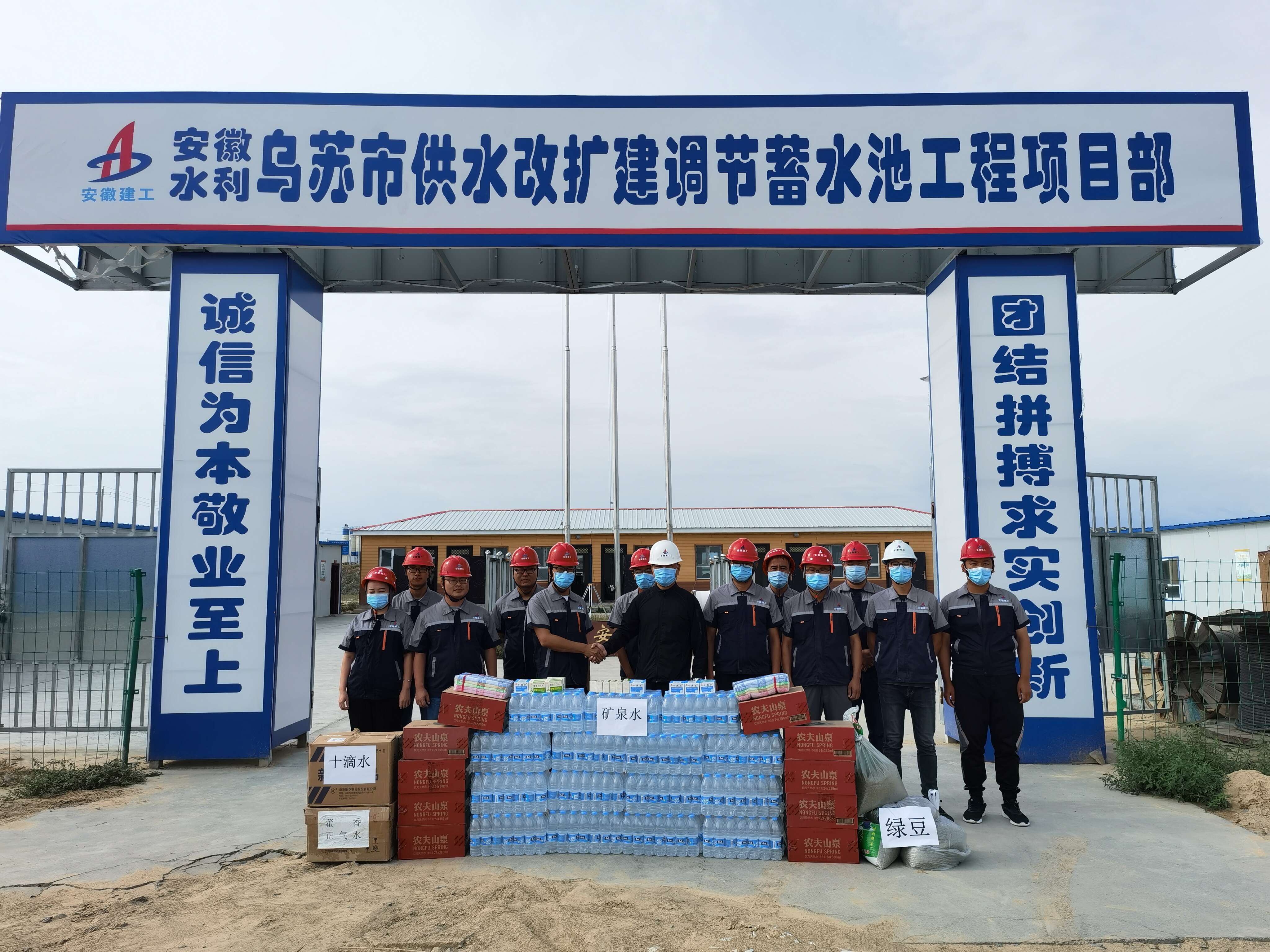 2021年7月14日上午,公司副總經(jīng)理王軍赴烏蘇市供水改擴建調節(jié)蓄水池項目“送清涼”,將礦泉水、綠豆、冰糖、藿香正氣水、十滴水、毛巾、香皂等防暑降溫物品送到一線員工手中。