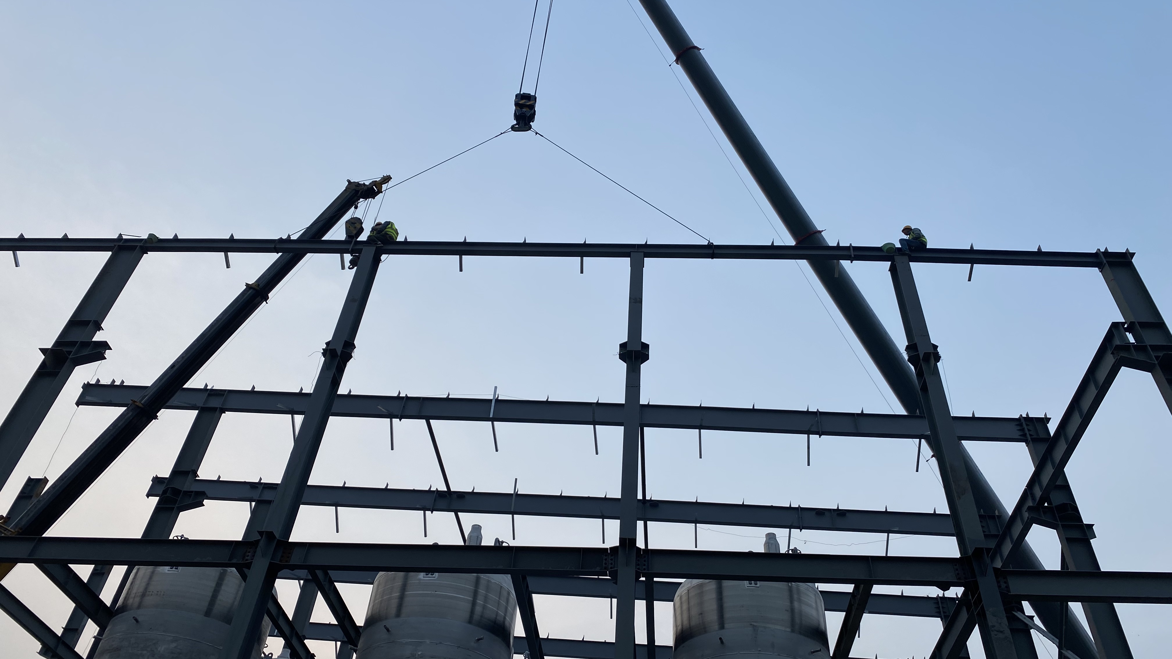 發(fā)酵車間吊車大臂高展,C區(qū)鋼結(jié)構(gòu)工程鋼梁安裝正在進(jìn)行,司索工鋼梁綁扎穩(wěn)固后,現(xiàn)場信號工發(fā)出清晰信號,經(jīng)驗(yàn)豐富的司機(jī)操控著吊車將鋼梁緩緩升起,20米的高空上,兩名安全防護(hù)的工人等待著鋼梁靠近,停穩(wěn)、就位、穩(wěn)固、矯正、固定...一道道鋼梁就這樣架起,發(fā)酵車間的金屬骨架就這樣拔地而起,逐步形成。