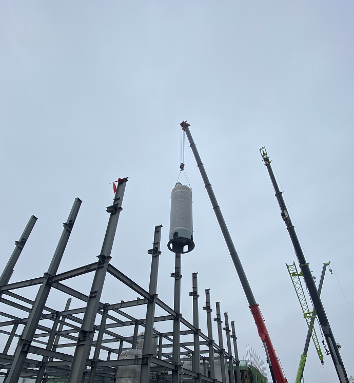 十余噸的罐體在吊車的牽引下緩緩升起,小心翼翼,精準(zhǔn)前往指定基礎(chǔ),施工人員進(jìn)行固定矯正...30多臺工業(yè)用罐就這樣矗立起來。
