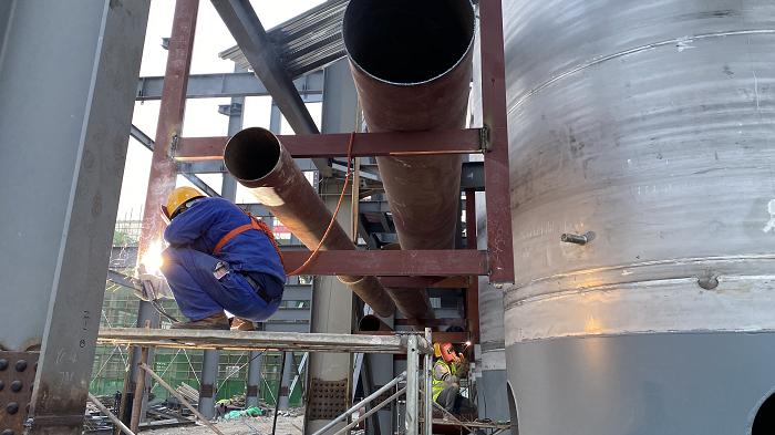 工藝管道班組也在忙忙碌碌,壓縮空氣管道在不斷架設(shè),料場加工好的管道在吊車、葫蘆的牽引下就位,專業(yè)的焊工進(jìn)行焊接,慢工出細(xì)活,保證每一道焊口符合規(guī)范要求,室外的循環(huán)水管也在與老廠的接口緊張對接。