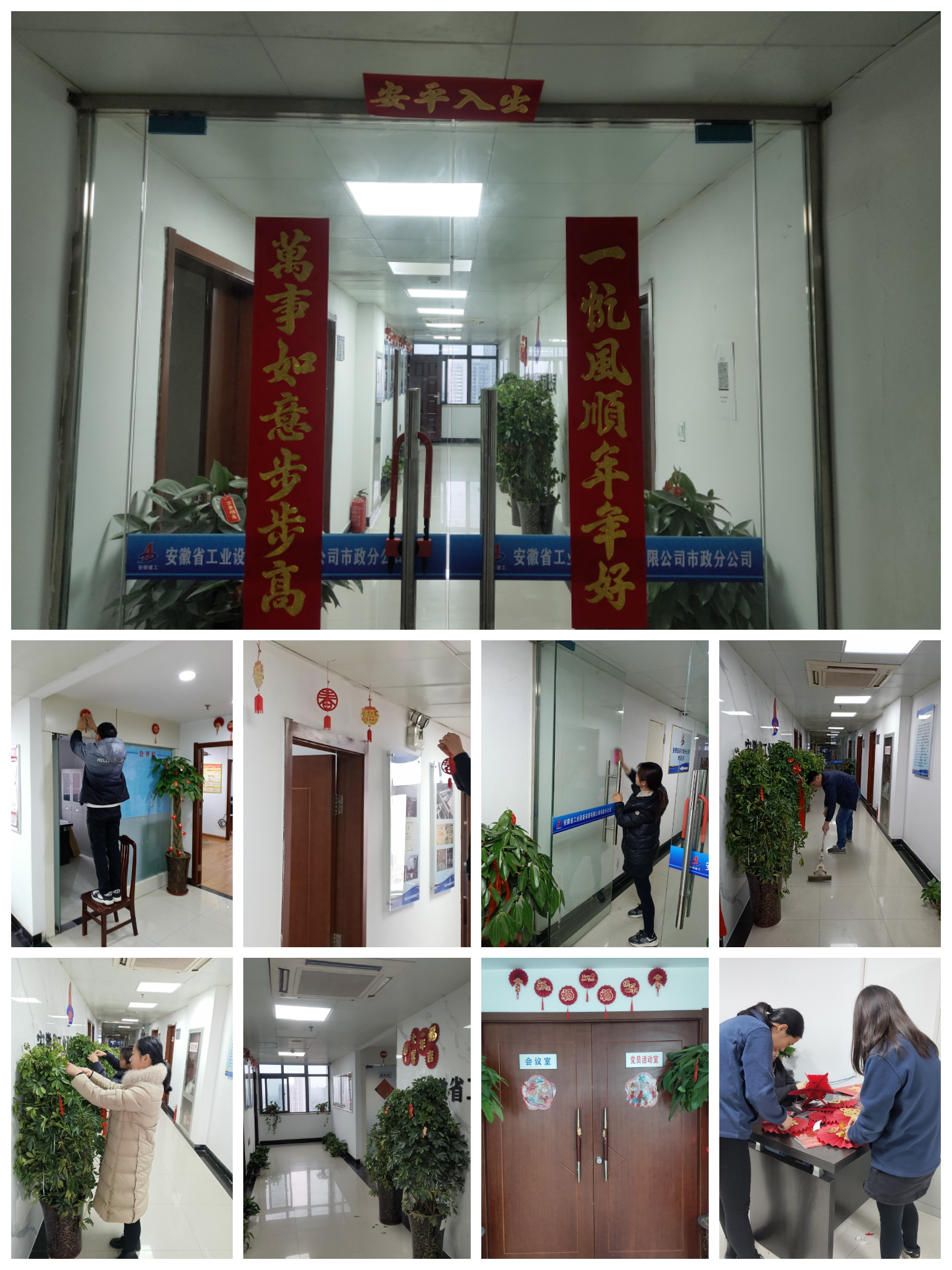 作為市政分公司掛牌成立后的第一個春節,工會提前準備好拉花、拉旗等喜慶裝飾物,號召機關青年、團員自己動手張貼。此次活動得到大家的積極響應,員工們齊心協力、分工協作對辦公區域進行衛生清潔與氛圍裝點,在機關走廊懸掛喜慶裝飾品,讓分公司處處充滿濃濃年味,紅紅火火、喜氣洋洋地迎接新一年的到來。