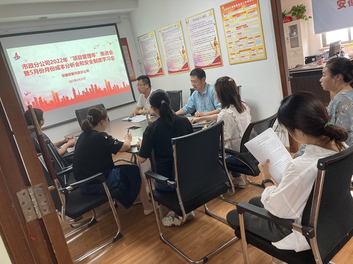 為進(jìn)一步推進(jìn)分公司項目管理年活動的開展,5月25日下午市政分公司在分公司會議室召開“項目管理年”推進(jìn)會暨5月份成本分析會議,黨支部書記胡迎東主持會議,分公司機(jī)關(guān)員工、項目員工參加會議,會議以現(xiàn)場加視頻方式召開。