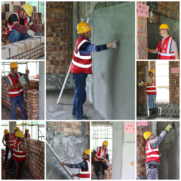 隨著分公司經理、黨支部副書記許杰熱情洋溢的動員講話,比賽正式拉開序幕。比賽中,選手們各顯神通,挑磚、測量、切割、砌筑、勾縫、找平、清理、抹灰等工序有條不紊,全力使自己的“作品”立面垂直、陰陽角方正、表面平整、線條順直、砂漿收水、基層濕潤。
