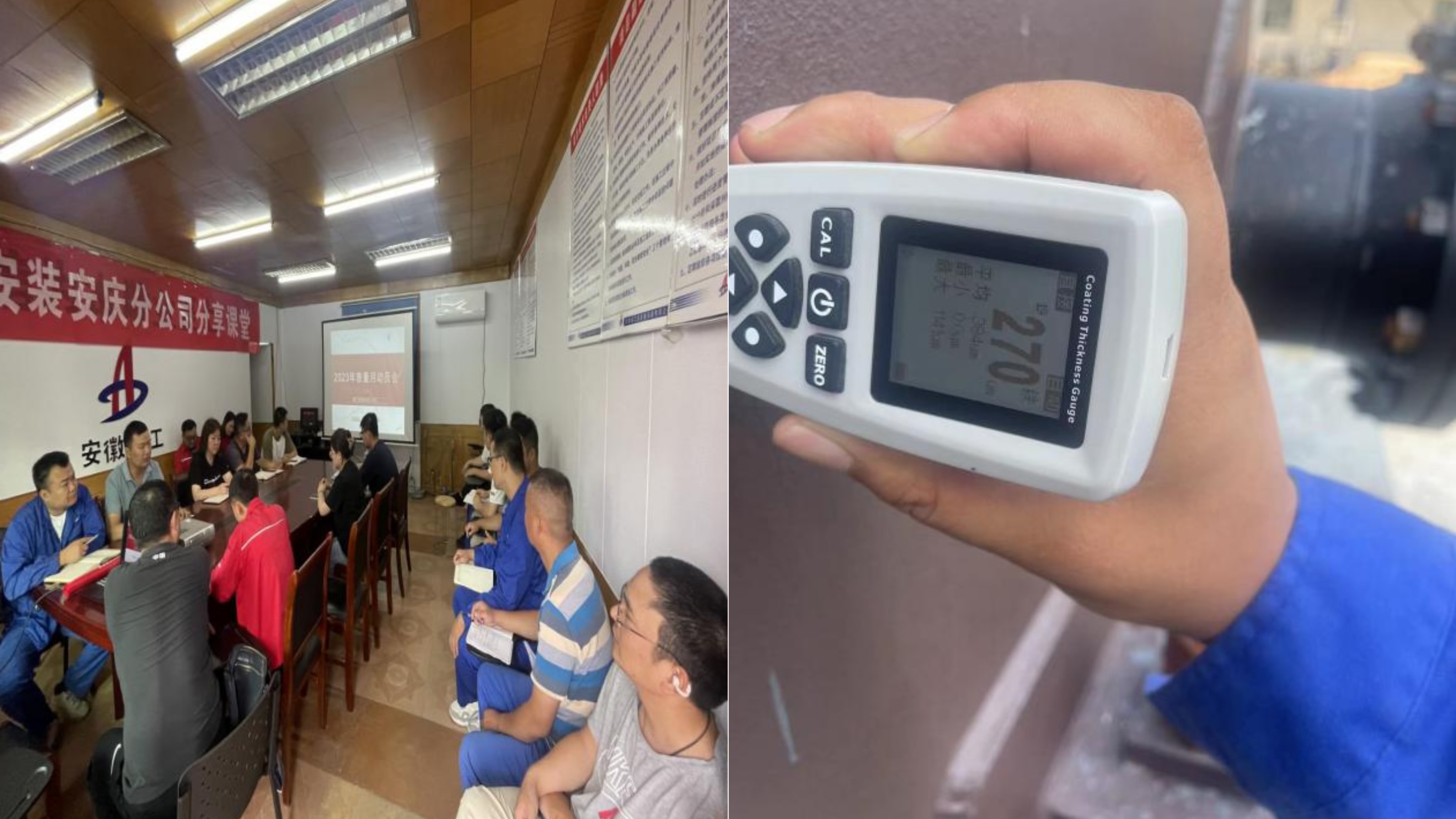 安慶分公司組織機關及所屬項目舉行“質量月”動員會,安慶石化循環水項目開展儲罐防腐保溫專項檢查(檢查中間漆涂層厚度)