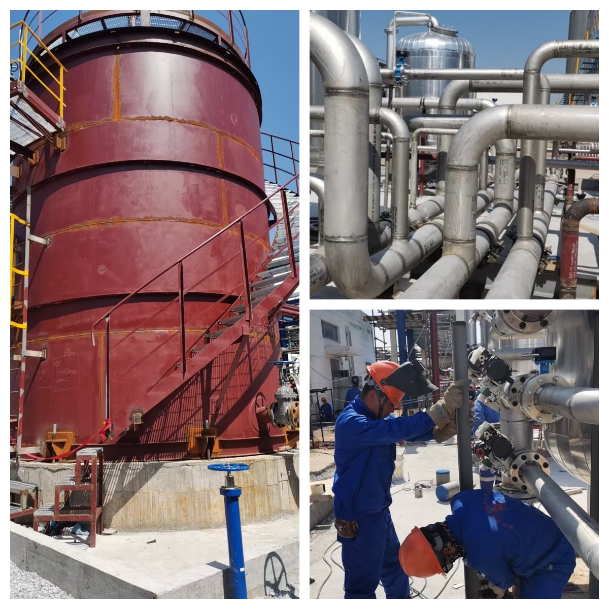 面對重重挑戰,土建、安裝、電儀等各專業在有限的施工區域和緊張的工期內緊密協作,加班加點,全力確保項目按期交付。安裝專業任務繁重,需現場制作1座120立方米儲罐,安裝4臺除鐵過濾器、3臺精密過濾器、3排管廊架以及2臺提升泵。此外,還需鋪設350米各規格(DN200、DN150、DN100等)的不銹鋼工藝管道和250米碳鋼管道。土建專業主要負責廢水輸送泵、廢水收集罐、精密過濾器、除鐵反應器設備及配套管架基礎的建設,以及后期地坪的恢復。電儀專業則需完成20千米電纜敷設,安裝2臺機柜、2臺操作臺、1套控制儀表設備和1套除鐵成套裝置儀表,同時完成2千米配管和200米槽盒的安裝調試工作。